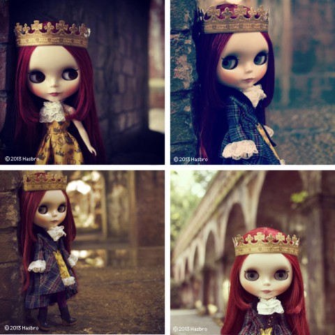 CWC Exclusive Neo Blythe “Royal Soliloquy” is a lovely actress of stage. *FREE SHIPPING FEE* *Shipping address are subject to the address of your Paypal transaction. Are you ready to be the queen of the stage? You will have the best part and rule the stage as a wave of applause erupts from the audience. A pile of red roses clutter the edge of the stage as their show of love for you. "Royal Soliloquy" wears a special queen stage costume. It has a classical taste but with a avant-garde and modern design flair. Her stage costume is an elegant dressing coat with a prop paper crown. Her one piece dress is luxurious and gold with crown motifs. The lace around the neck is lovely and beautiful. Her dressing coat has a three layered peplum with ruffles around the hem. She wears lovely agile tights and cute boots. She has long hair with a slight body curl, parted down the middle. She has a mature style hair cut with shoulder length side parts, like an elegant hime cut. She deep red hair makes the gold of her dress shine! "Royal Solioquy" has a gorgeous presence that makes her shine on the stage like as actress. Her dark brown eyeshadow, orange blush and pink lips are bold. She has a special kind of eye make up of the cat eye style eyeliner. This is an innovation for Neo Blythe! She has special mint green, yellow green, and light brown eyes. She has a special fair skin with Radiance+ mold. She has a metallic black pull ring and gold stand. Face Type: Radience+ Skin Type: Cream Make-up: Dark brown eye shadow, pinky beige lipstick, orange cheeks. Eye Color: Mint green (front), brown (right), yellow green (front), light brown (left) ** All special eyecolors. Eyelid: Dark brown (colored molding) Hair Color: New Deep Burgundy color Manicure: Red Earrings: Heart Posts Set Contains: Dress, jacket, tights, earring, boots, underpants, stand and paper crown. Release Date: 09 November 2013 We accept payment by PAYPAL, VISA and WESTERN UNION Thank you. Please don't hesitate to contact us at cctoyshop@yahoo.com.hk if you have any question about this product.