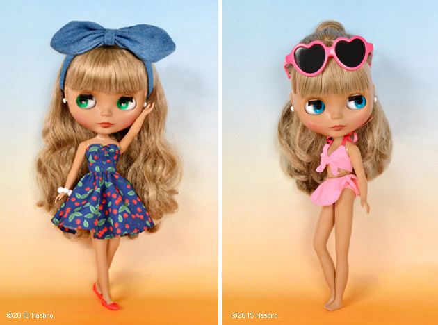 Let’s start Summer with our lovely tanned Neo Blythe “Cherry Beach Sunset” *FREE SHIPPING FEE* *Shipping address are subject to the address of your PayPal transaction. Cherry Beach Sunset sits under the shining sun on a sandy white beach along side the deep blue sea. She spends her day relaxing by collecting seashells and reading in the shade of a palm tree. She wears a cute bikini and a lovely sundress. They can be worn together or separately. The halter top bikini has a cute tie strap in the front, it’s paired with a skirted pair of bottoms for a fun and sassy beach look. She comes with heart shaped sunglasses in pink frames. Her lovely sundress is dark blue with bright red cherries all over. She’s got great accessories like her heart shaped earrings and white bead bracelet. She comes with a fun denim hair band that can be worn with both the dress or swimsuit. She comes with red flat shoes that match perfectly with the cherries on her dress. Her hair has a slight perm with straight bangs. She looks good with her hair up high in a ponytail or worn down. She wears brown eyeshadow, pink cheeks and bright coral lipstick. She has a special emerald color eyechip that is front facing. Her face is Radiance + with mocha colored skin. Face Type: Radiance + Skin Type: Mocha Make-up: Brown eyeshadow, coral pink lips, pink cheeks Eye Color: Special Emerald Green (front), then stock colors. Hair Color: Light Brown Earrings: Yes The set includes: Doll, swimsuit, dress, hair accessory, sunglasses, shoes, bracelet, and stand. Release Date: July 17, 2015 We accept payment by PAYPAL, VISA and WESTERN UNION Thank you. Please don't hesitate to contact us at cctoyshop@yahoo.com.hk if you have any question about this product.