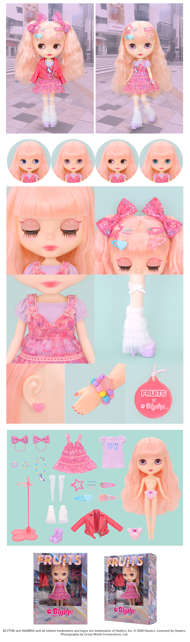 Neo Blythe X “FRUiTS” Collaboration! Announcing the illustration for the CWC-exclusive Neo Blythe “Fruity Kaleidoscope”. *FREE SHIPPING FEE* *Shipping address are subject to the address of your PayPal transaction. As I wandered down the hill toward the bustling intersection of Harajuku, a cheerful photographer called out with a grin. “Mind if I snap your photo for FRUiTS?” he asked. My heart skipped-FRUiTS! That iconic magazine that captured Tokyo’s most daring and delightful street fashion. I struck my pose, hoping the sparkle in my eyes and the flair in my look might just land me on the cover. Oh, wouldn’t that be a dream? Today, I look absolutely adorable! “Fruity Kaleidoscope” is a girl who freely enjoys "being herself" with her favorite items. Her pop and decorative fashion style is cheerful and cute. This is a heart-fluttering collaboration with “FRUiTS,” a special doll designed with the theme: “What if Blythe were featured in FRUiTS?” The star of the fashion is the original print camisole dress designed with past covers of “FRUiTS.” It uses a slightly sheer fabric, and the light silhouette switched at the under bust is the key point. For the inner layer, it is paired with a light purple mini-length T-shirt dress. The aurora print on the chest catches the eye, making it an exciting item that lifts your mood even when worn on its own. To finish the look, she wears a shocking pink rider's jacket. This slightly mischievous piece can swing either rock or girly, adding spice to the outfit. For accessories, colorful “cheap-cute” items are packed together. The set includes a matching necklace and double bracelet, voluminous hairpins, and a ribbon made from the same fabric as the dress, allowing you to freely combine them and enjoy original styling. For her feet, she layers tiered leg warmers over lacy white socks and pairs them with light purple four-strap shoes. A new lightweight and soft material is used for the hair. With a mix color of milky pink × creamy white and a firm perm, it is styled into fluffy, sweet hair like cotton candy. The stand and eye-change charm use the same clear pink color. The charm is a special specification with the FRUiTS logo printed on it. The makeup is finished in a pink tone that is lovable while also expressing the character of “Fruity Kaleidoscope.” For the eye makeup, softly tinted pink shadow is paired with dusty rose eyeliner at the outer corners for an accent. Blush is softly placed high on the cheeks and on the tip of the nose to enhance a healthy glow. For the lips, a cool-toned pink was chosen for a “non-flattering cuteness” that isn’t just sweet, featuring a gradient spreading outward from the center. One of the eye colors, Lilac (front view), features a special design with star-shaped holograms, and the other three colors are also all special colors. Face Type: Radiance Evolution Face Color: Snow Makeup -Eyeshadow: Pink -Eyeliner: Dusty Rose -Lips: Pink (full shape) -Blush: Pink (applied slightly above the cheeks and on the tip of the nose) Eye Colors (all special colors) -Salvia Blue (right) -Lilac (front, star-shaped hologram) -Brown (left) -Blue Green (front) Eyelids: Pink (mold color) Eyelashes: Special type / Black Hair Color: Milky Pink × Creamy White (new material / new color) Earrings: Yes (pink heart shape) Manicure: Yes (Pink) Set Includes: -doll, camisole dress, T-shirt dress, rider's jacket, hair ties (2), hairpins (7), necklace, bracelets (2), earrings, leg warmers, socks, shoes, shorts, stand (waist support) Release Date: Friday, April 17, 2026 We accept payment by PAYPAL, VISA and WESTERN UNION Thank you. Please don't hesitate to contact us at cctoyshop@yahoo.com.hk if you have any question about this product.