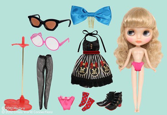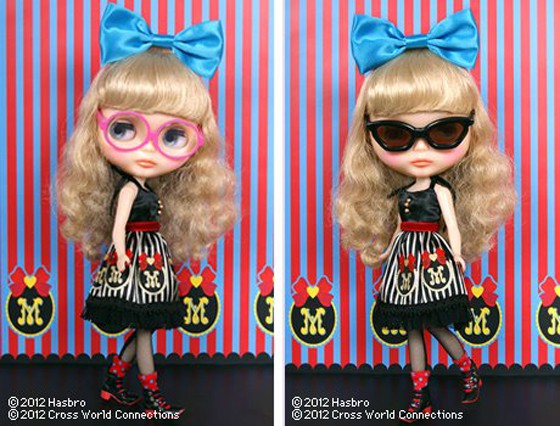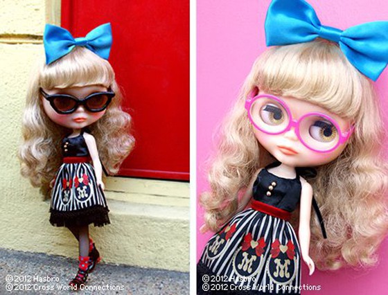 Final Design for “Miyuki Odani x Blythe” Collaboration Doll! CWC Limited Neo Blythe “Margo Unique Girl”! *FREE SHIPPING FEE* *Shipping address are subject to the address of your PayPal transaction. This spring, our newest collaboration girl will be released! Please take a look at this Miyuki Odani designed girl. Margo is your unique friend. When you have problem, you can consult with her and she will always give you great advises. She is cool and stylish. Her fashion matches well with her glasses. Margo’s one-piece looks simple but actually it’s full of complicate designs! Her top is made of neon black fabric decorated with gold beads. The halter-neck ribbon is black velvet and there is also a velvet red ribbon on the waist. Her skirt has a circus tent image full with humor and fun. Her over-skirt has black and beige stripes base with Margo’s initial “M” emblem (the initial frame is gold with red ribbon and small gold heart) printed. The skirt also has black lace on the rim. Her under-skirt is pannier like tulle. The fabric has small polka dot pattern and you can see it below her over-skirt. Margo’s most important fashion items are her glasses! She always wears vivid pink round glasses and black sunglasses. Her shoes and socks also have special designs too! She is wearing black tights with red x blue polka dot socks. Her shoes are 4 straps black shoes with red heels! For her hair, she has bangs but her hair is curly long hair which make she looks nice when she wears her glasses. Her hair color is light ash brown decorated with a big blue satin ribbon. Margo’s skin is our newest style! Her skin is half transparent fair (natural color) skin which looks different from our previous half transparent skin dolls. Her make-up is light brown eye shadow, newly designed lip shape in pink salmon and pink cheek. Her eye colors are one default pink and three special colors; light blue grey, light green and yellow. She also comes with gold and red stand. She also has a clear red pulling with gold glitters. Face type: radiance Skin type: Half transparent fair (natural skin) Make up: eye shadow: light brown/ lips: salmon pink/ cheek: pink Eye colors: light blue grey (left, special color), light green(center/ special color), yellow (right, special color) , pink (center). Hair color: light ash brown Earrings: no earring. Manicure: red. Whole set: doll, one-piece, hair accessory (ribbon), round glasses, sunglasses, socks, net tights, shoes, shorts and stand. Limited of 1000 dolls. We accept payment by PAYPAL, VISA and WESTERN UNION Thank you. Please don't hesitate to contact us at cctoyshop@yahoo.com.hk if you have any question about this product.