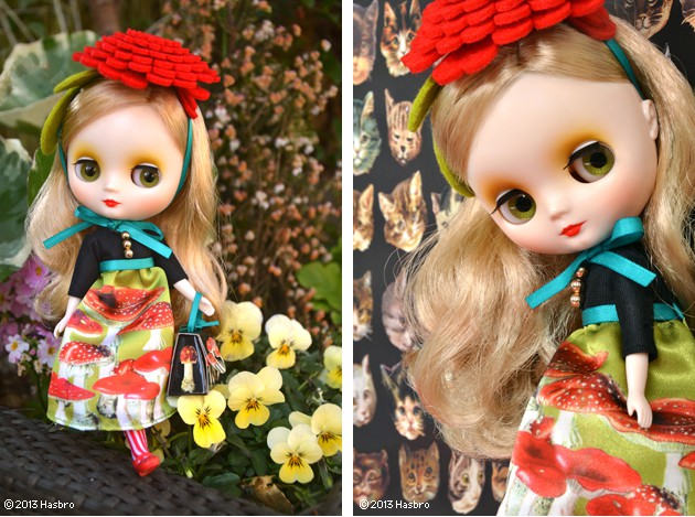 CWC Exclusive Middie Blythe Nekogutsu Zukin *FREE SHIPPING FEE* Shipping address are subject to the address of your PayPal transaction. Fashion brand Muchacha & Achachum have collaborated for CWC Ex Middie Blythe “Nekogatsu Zukin” Middie Blythe Nekogatsu Zukin she is the guardian of the Miracle Mushroom Garden in the village of Muchacha, of the country of Achachum. The magical garden brings happiness to everyone in in Achachum. It is a strange and mysterious place! Nekogatsu Zukin's shoes are bright red with little cat faces on them. Legend has it when she walks, her shoes say "meow meow". The denizens of Achachum are very fashionable and they love to wear cute hoods for their day to day fashion. Nekogatsu Zukin wears a cute empire waist dress with a bold mushroom pattern. Her big red head piece is a lovely flower which ties under her chin. The bright petals of the flower attracts the gaze of the villagers. Her white and red striped tights are a great compliment to the mushroom print dress. She has long, light brown hair, set in a slight perm. Her makeup was chosen with the utmost consideration to match her fashion. She has fair skin and the lovely make up fives her a mature expression. She has light green eyes, the color of the woods. Hair: Light Brown Eye shadow: Cream Blush: Orange Lip: Red Eye color: Light green Skin type: Fair Set includes: Doll, dress, hair accessory, shoes, tights, shorts, bag, and stand. Release Date: March 22, 2013 We accept payment by PAYPAL, VISA and WESTERN UNION Thank you. Please don't hesitate to contact us at cctoyshop@yahoo.com.hk if you have any question about this product.