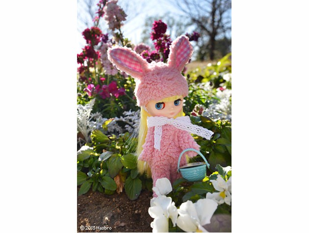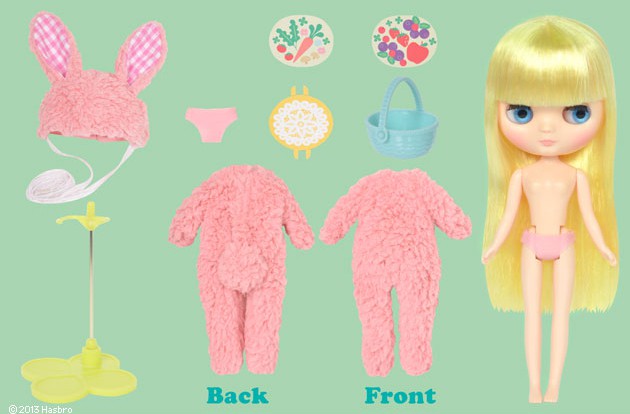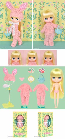 Pink and cuddly Middie Blythe “Nellie Nibbles” *FREE SHIPPING FEE* Snuggly and sweet, Middie Blythe wears a one piece animal suit with cute long bunny ears cap! Nellie Nibbles loves organic salad! The animal suit and hat is made from a super fluffy material. The inside of the bunny ears is accented with pink gingham. The cap ties with a sweet lace, giving it a sweet and girly touch. Nellie Nibbles grows her own vegetables in the garden. Her blue basket is perfect for gathering up all her fresh veggies. There is a special printing on the packaging where you can cut out the fruits and veggies to put in your basket! She has blonde, long straight hair with bangs. She wears brown eyeshadow, pink lips and pink cheeks. Her eyes are light blue. She's a lovely girl to wear all kinds of fashions! Skin Type: Fair Make-up: eyeshadow brown, lip pink, blush pink Eye Color: Light Blue Hair Color: Blonde The set includes: Doll, animal body suit, cap, shorts, basket and stand. Release Date; April 12, 2013 We accept payment by PAYPAL, VISA and WESTERN UNION Thank you. Please don't hesitate to contact us at cctoyshop@yahoo.com.hk if you have any question about this product.