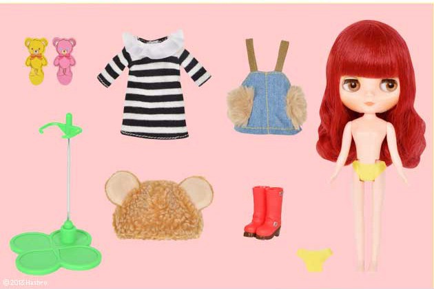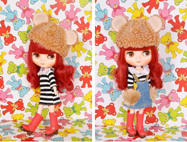 Middie Blythe “Furry Bella Bo” is the cuddly bear girl who heals everyones hearts *FREE SHIPPING FEE* Shipping address are subject to the address of your PayPal transaction. "Furry Bella Bo" brings a warm feeling to hearts of everyone around her. Her bright smile makes you want to hug her tightly in a bear hug. She wears a sweet casual outfit with striped top and denim skirt with fluffy pockets. The top has cute 3/4 length sleeves and a cute ruffle collar. She has two cute bear friends in her pockets to keep her company. She wears a sweet bear cap. Her long red boots have a brown sole and silver color buckle. Her dark red hair is her special charm point, with a long loose perm and bangs. Her green eyeshadow and cute makeup gives her a healthy glow. Her pupils are set to light brown Skin: Regular Makeup: Green eyeshadow, orange blush, and orange lips. Eye Color: Light Brown Hair Color: Dark Red The set includes: Doll, hat, tops, overalls, boots, stand, shorts, paper accessories of two bears. Release Date: October 11, 2013 We accept payment by PAYPAL, VISA and WESTERN UNION Thank you. Please don't hesitate to contact us at cctoyshop@yahoo.com.hk if you have any question about this product.