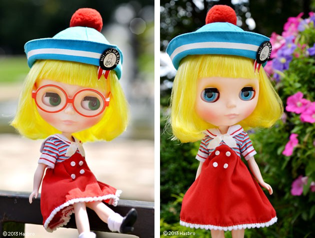 Neo Blythe “Hi!-Ho! Marine” will sail into your hearts *FREE SHIPPING FEE* *Shipping address are subject to the address of your Paypal transaction. This summer, lets go racing toy boats! We are announcing the final specifications of the Neo Blythe "Hi!-Ho! Marine." The fountain down at the park is the perfect place to race our boats! Once they start going, the water feels so large, it’s almost like being at the lake! "Hi!-Ho! Marine" enjoys wearing sailor outfits fit for the summertime. Her white one piece dress has a red line running through the sailor collar, a bordered top section, and a vibrant red skirt that flows outward, giving her a stunning “A” shaped silhouette. The sky blue gob hat is topped with a large pom-pom, and emblazoned with an adorable octopus emblem. Her favorite red round rimmed glasses are on the large side, and her bright white socks and pitch black one-strap shoes enhance her energetic and cheerful personality. Her lemon yellow hair is bobbed short and has a slight curl on the front. Her makeup is natural and puts her vitality filled character first and foremost. Her front facing eyes are a specially crafted light blue, and her stand is white. [Face Type] Radiance+ [Skin Type] Fair (Natural Skin) [Make Up] Eye Shadow: Yellow Brown, Lip: Pink, Cheek: Pink [Eye Color] Light Blue (front *special color), Green (right), Pink (front), Blue (left) [Hair Color] Lemon Yellow [Set Contents] Doll, One Piece, Gob Hat, Glasses, Shoes, Socks, Shorts, Stand Release Date: August 9th, 2013 (Fri) * The Radiance + mould is taken from the original 2006 Radiance face mould. We accept payment by PAYPAL, VISA and WESTERN UNION Thank you. Please don't hesitate to contact us at cctoyshop@yahoo.com.hk if you have any question about this product.