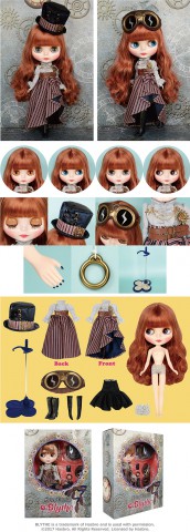 How Handsome is Her Steam Punk Look! Hasbro Exclusive Neo Blythe “Sherry Victorian” Final Specs! *FREE SHIPPING FEE* *Shipping address are subject to the address of your Paypal transaction. Sometimes, I like to travel through time to meet my friends. Who you ask? H.G. Wells and Jules Verne of course! I love to chat with them, thinking up new concepts for our books and inventions. Sherry Victorian loves Neo Victorian Steam Punk fashion! The intricately made high function machinery and the unique and cutting edge steam based inventions give her look a classical yet modern atmosphere. She wears a Steam Punk inspired dress, with her blouse decorated with a bloom of frills. Her sleeves and shoulders are based off of a high class Victorian silhouette, with an added speckling of celestial charms. Her asymmetrical fishtail skirt prominently features her underskirt. The whole look is complete with a large ribbon and fake leather belts! As any proper Neo Victorian lady should, Sherry also wears a silk hat with steam punk goggles attached. At her feet, she wears knee high socks and a pair of long boots. Her face type is Radiance+ and her face color is cream. Her brown hair is long, permed lightly with her bangs cut across. Her eyeshadow and eye lids are brown, and her eye lashes are a special brown. Her lips are a special pinkish red. One of her front facing eyechips are gray, and her left facing eyechips are purple. Face Type: Radiance + Face Color: Cream Makeup: Brown eyeshadow, red lip, rose cheek Eye Color: orange (front), blue (right), gray (special color), purple (special color) Eyelid: Brown (molded color) Eyelash: Special Brown Hair Color: Reddish Brown Earrings: None Manicure: Dark Blue Set Includes: Doll, one piece dress, under skirt, hat, goggles, socks, boots, shorts, and stand (17.5 cm) Release date:October 27, 2017 We accept payment by PAYPAL, VISA and WESTERN UNION Thank you. Please don't hesitate to contact us at cctoyshop@yahoo.com.hk if you have any question about this product.