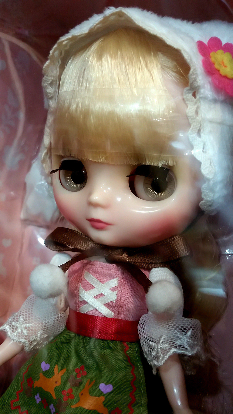 Middie Blythe “Oski tebyA lyublyU” is a special girl who lives in the forest with the bears *FREE SHIPPING FEE* *Shipping address are subject to the address of your PayPal transaction. "Living in the forest with the bears and nature is a lovely fantasy. I want to live there with Misha and Suri. We will share a happy life together." Oski is dressed in Northern European folk dress with cute motifs of animals and nature. The coordination of her dress, apron and ribbons gives this quant fashion look. Her blouse has puff sleeves with cute lace detail at the bodice. Her sweet skit has the traditional folk motif printing. This is accentuated by her sweet apron printed with rabbits and flowers. She wears a white fur bear hat with tiny lace around the edge and a lovely flower at the ear. With her cute bear hat she fits right in with Misha and Suri! To finish her look she has white tights and red strap shoes. She has a healthy glow to her with hr fair skin and soft make-up. She has long blonde hair set in a perm with bangs. Her final charm point is her soft, light brown eyes. Skin: Fair Make-up: yellow green eyeshadow, pink blush and lip. Eye Color: Light brown Hair Color: Blonde The set includes: Doll, dress, apron, bear hat, tights, shoes, underpants and stand. Release Date: September 19, 2014 We accept payment by PAYPAL, VISA and WESTERN UNION Thank you. Please don't hesitate to contact us at cctoyshop@yahoo.com.hk if you have any question about this product.