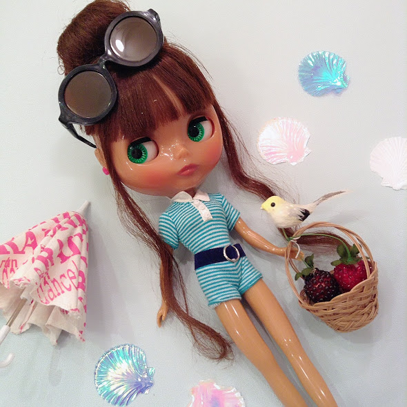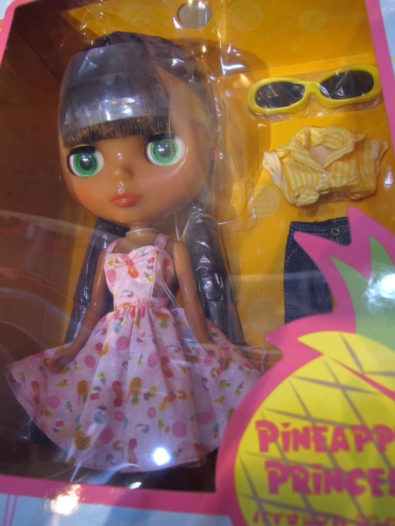 Doesn’t her tanned skin dazzle against the sun? Neo Blythe Pineapple Princess is coming soon! *FREE SHIPPING FEE* *Shipping address are subject to the address of your PayPal transaction. I love those sweet, juicy pineapples that have soaked up the summer sun! Nowadays I love to have it in cold ice tea. I love pineapples so much that my boy friend calls me "Pineapple Princess"! I love my boyfriend and my new nick name! American 50's fashion is Pineapple Princess' favorite look. She has an assortment of outfits, for the beach, out on the town, and even for sports! Change her clothes to match the occasion! Her tanned, translucent skin and her bright aura is exactly what you expect from the Pineapple Princess! The fabric of her dress is specially printed with an original pattern of pineapples and drinks. Along with the flowing skirt and the gather on the chest, the dress has tons of girlish charm. The capris she is wearing are made from denim. Her french sleeved shirt is perfect in any combination; over her dress, with the cherry pink heart ear rings and pumps, the vivid colors give her a sprightly and energetic ambiance. The hair band that comes with the dress is a great way to mix up her look too! Her face color is a newly made translucent Mocha color, which has a alluring subtlety to it. Her face type is Radiance Renew. Her hair color is brown, and her hair style is a slightly permed long with short bangs. Her eyeshadow is dark brown, and her cheeks and lips are almond pink. One of her front facing eyechips are light green. Face Type: Radiance Renew (Based on the Radiance mold) Face color: Translucent Mocha Make up: Eyeshadow - Dark brown, Cheeks and Lips - Almond Pink Eye color: Light green (front) *special color, Blue (right), Pink (front), green (left) Eyelashes: Black Hair color: Brown Ear rings: Cherry pink hearts Manicure: n/a Set includes: Doll, dress, shirt, pants, sunglasses, hair band, ear rings, socks, shoes, shorts, stand (17.5 cm tall) Available: July 14, 2017 We accept payment by PAYPAL, VISA and WESTERN UNION Thank you. Please don't hesitate to contact us at cctoyshop@yahoo.com.hk if you have any question about this product.